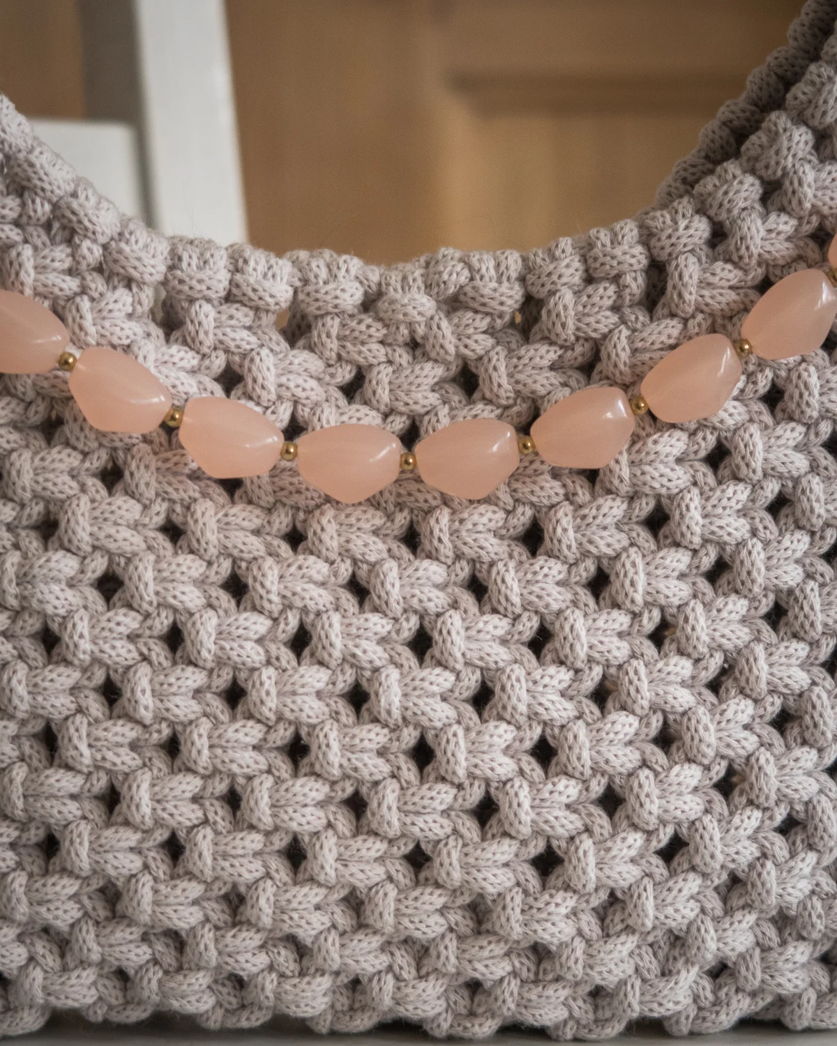 Ta torebka w stylu boho zachwyca grubym, dekoracyjnym makramowym splotem oraz dodatkiem dekoracyjnego łańcuszka, który dodaje jej charakteru.