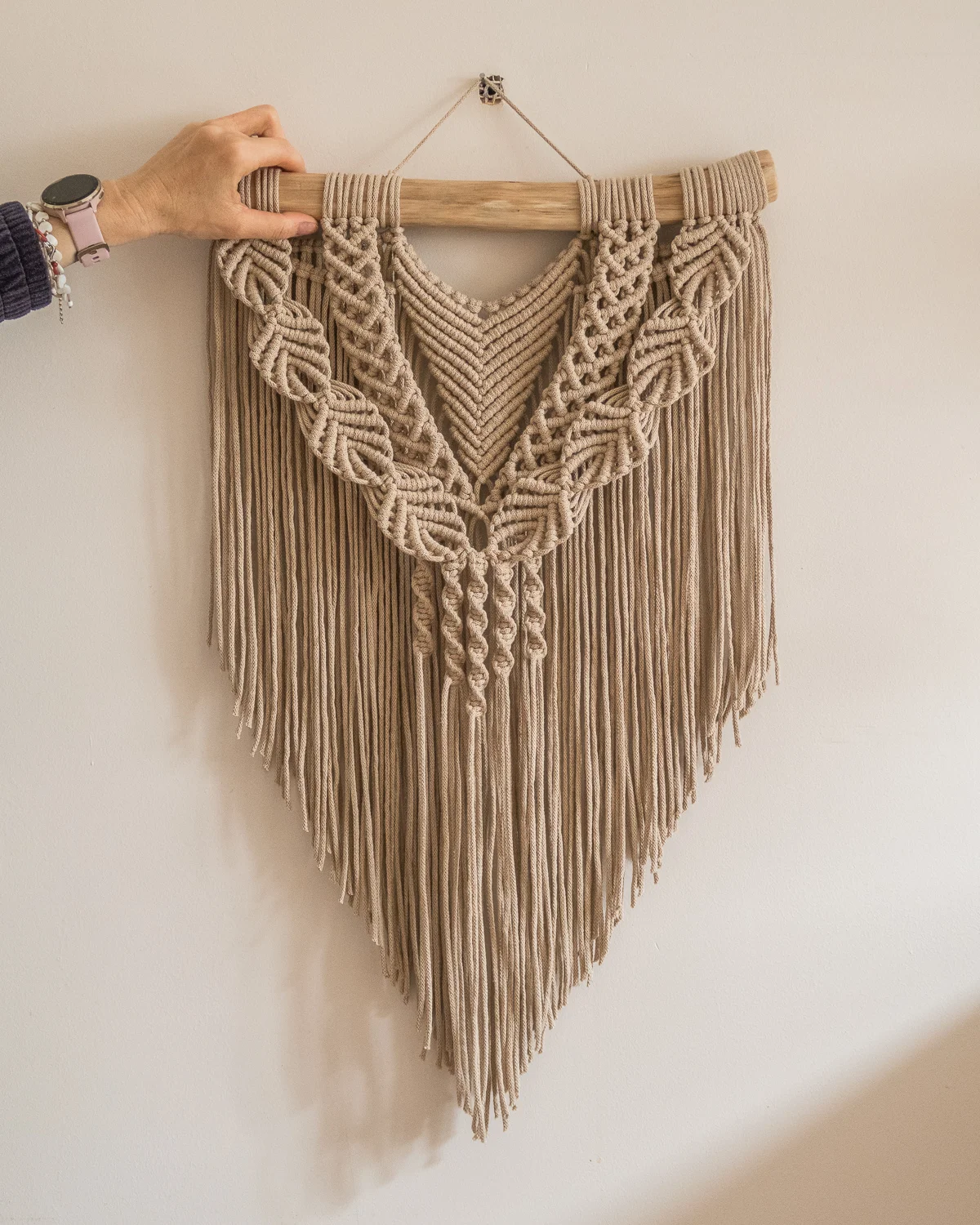 powieś na niej makramę. Makrama posiada odpowiednią zawieszkę do zawieszenia.