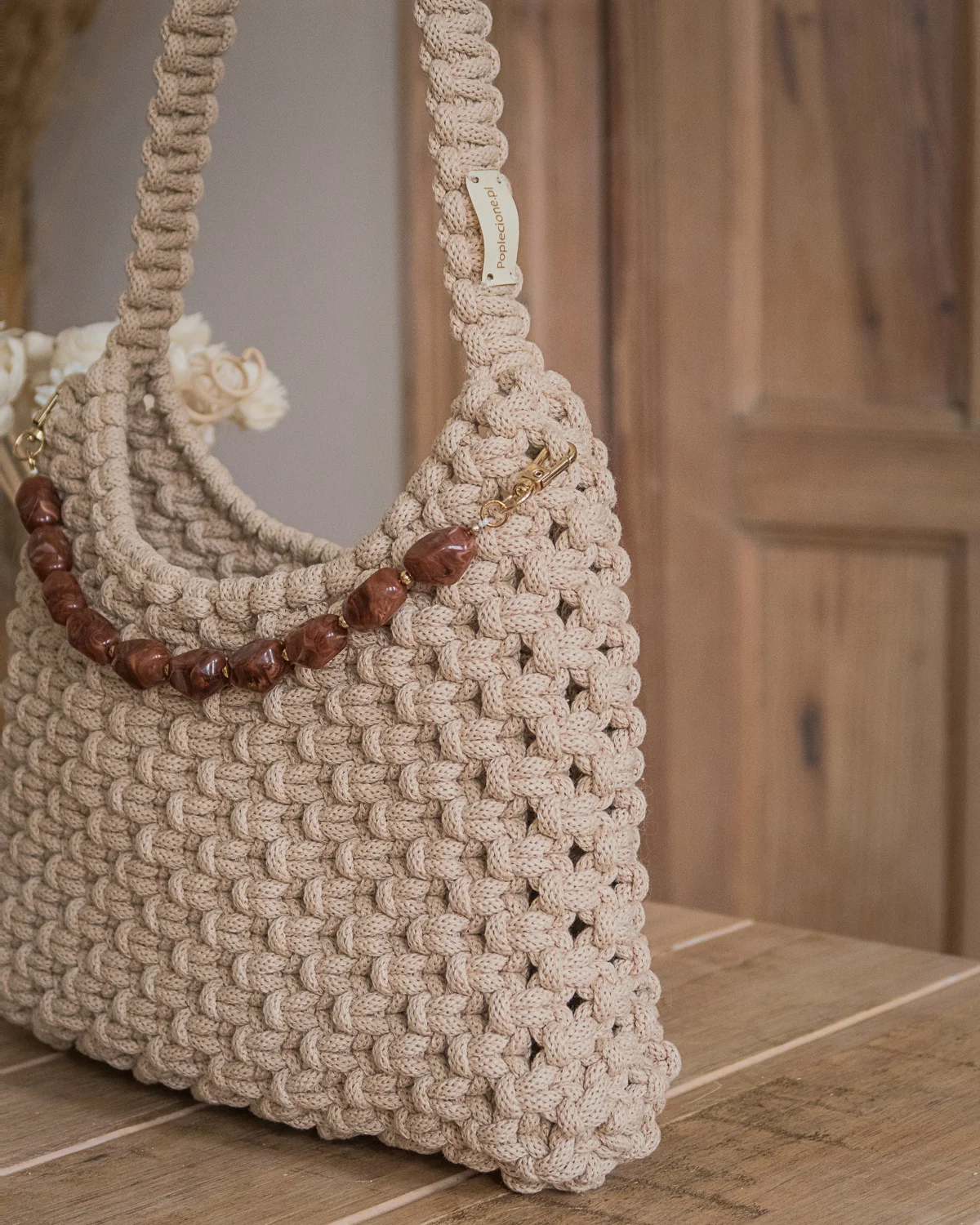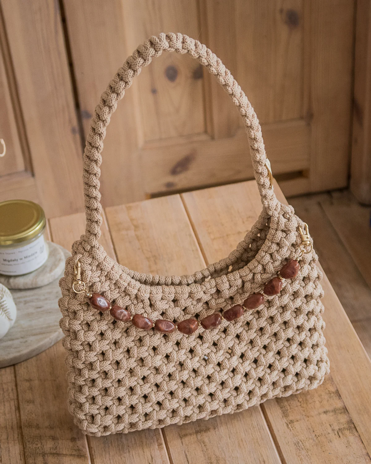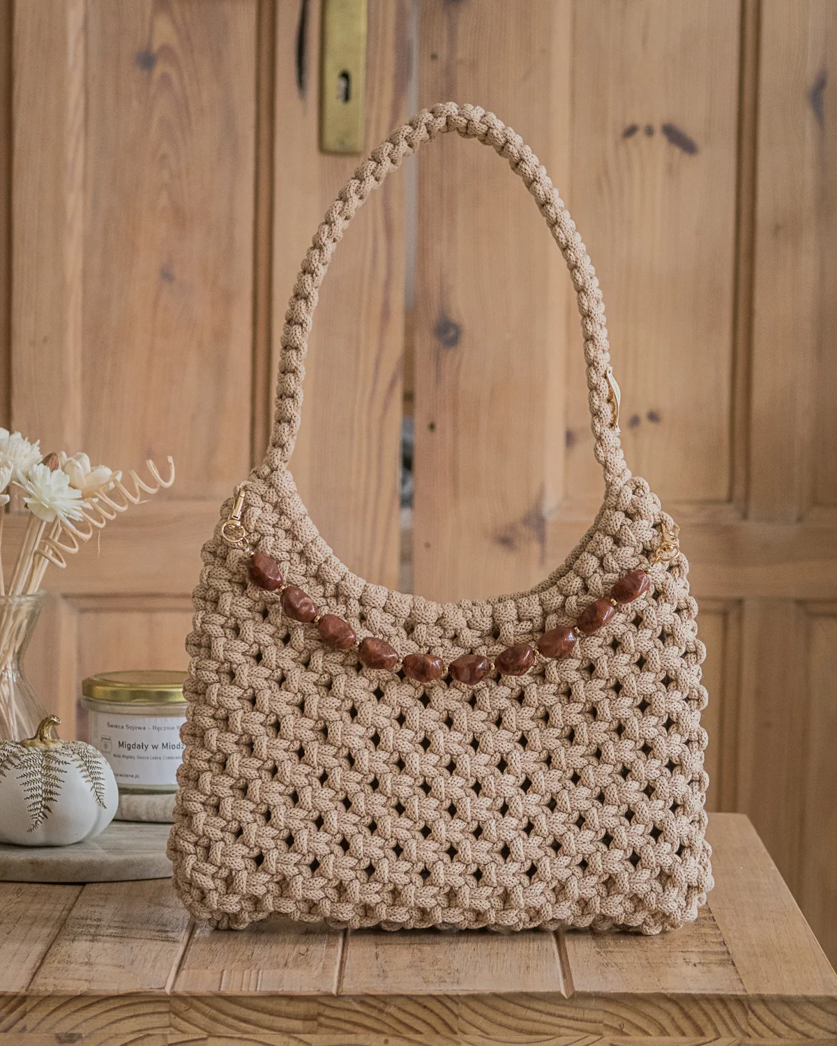 Ta torebka w stylu boho zachwyca grubym, dekoracyjnym makramowym splotem oraz dodatkiem dekoracyjnego łańcuszka, który dodaje jej charakteru.