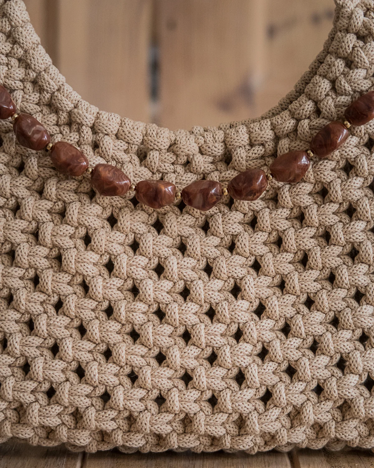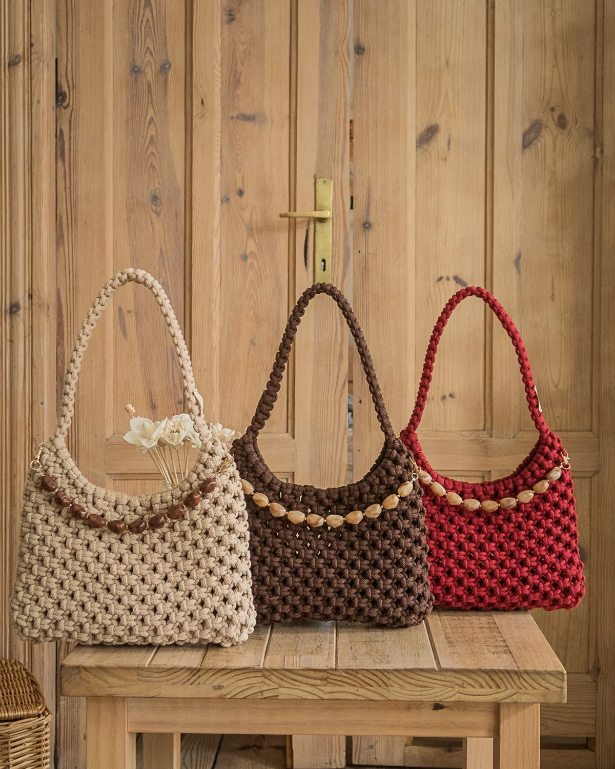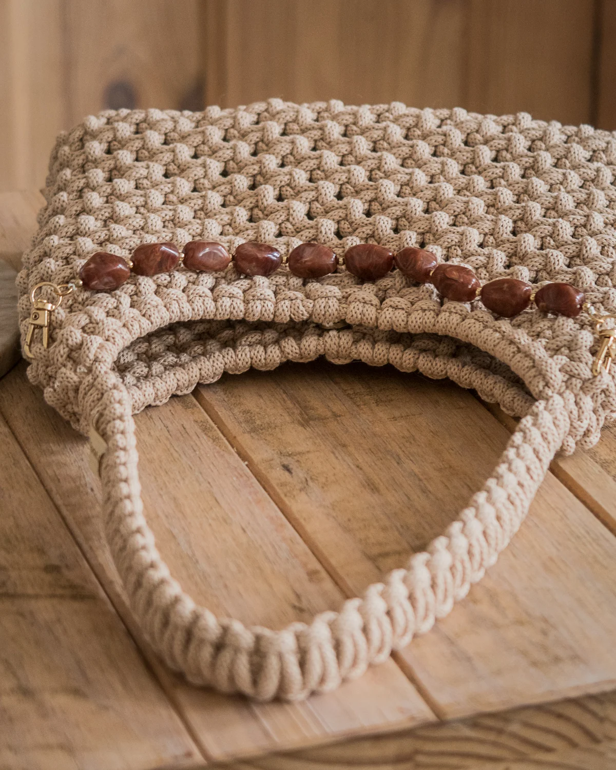 Ta torebka w stylu boho zachwyca grubym, dekoracyjnym makramowym splotem oraz dodatkiem dekoracyjnego łańcuszka, który dodaje jej charakteru.