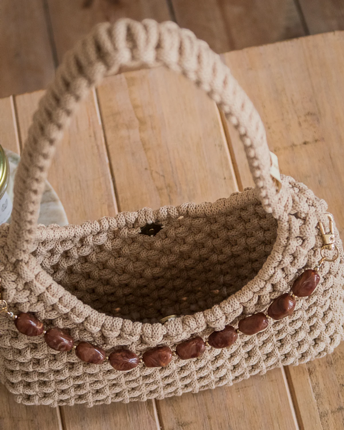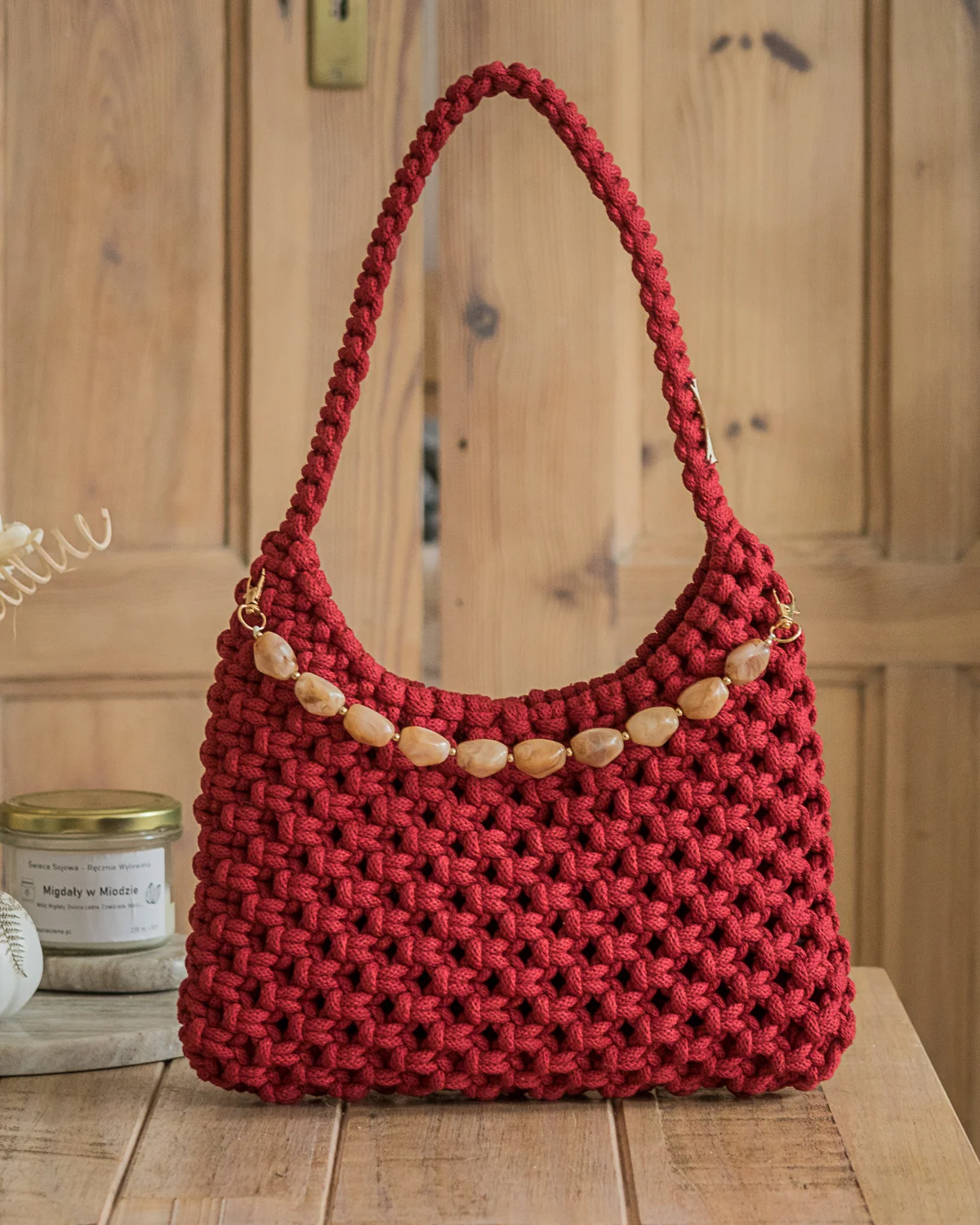 Ta torebka w stylu boho zachwyca grubym, dekoracyjnym makramowym splotem oraz dodatkiem dekoracyjnego łańcuszka, który dodaje jej charakteru.
