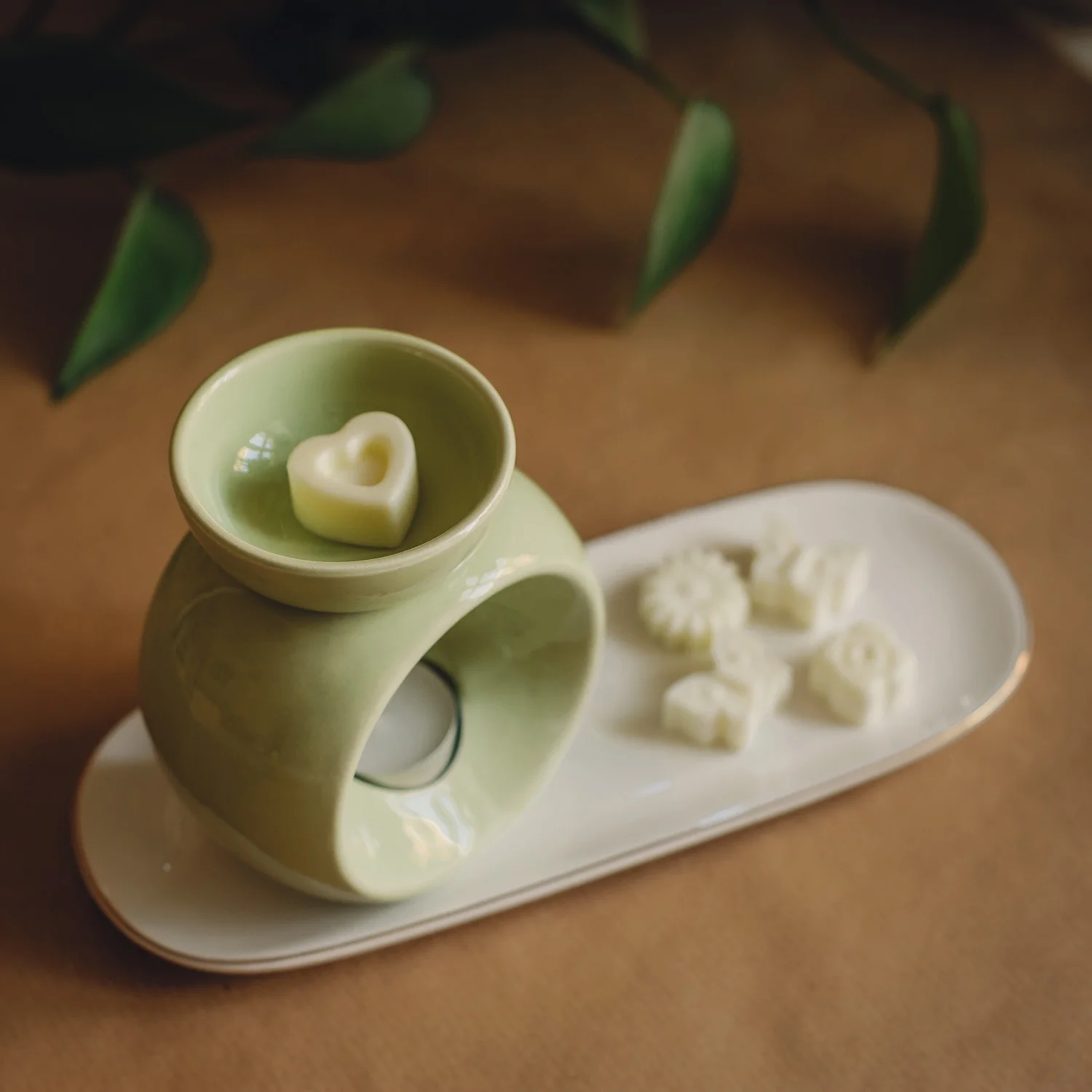 W skład zestawu wchodzą ceramiczny kominek zapachowy oraz 5 saszetek z woskami zapachowymi (2 sztuki w saszetce)